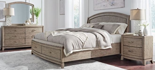 Create a calm and peaceful oasis with the Avalon king panel storage bed, dresser, mirror, and nightstand. Crafted with excellence using Rubberwood solids and Split Heart White Oak veneers, this set features a Burnished Beige finish. The journey into the enchanting allure of this set begins with the softly arched cap rail of the headboard.Read More