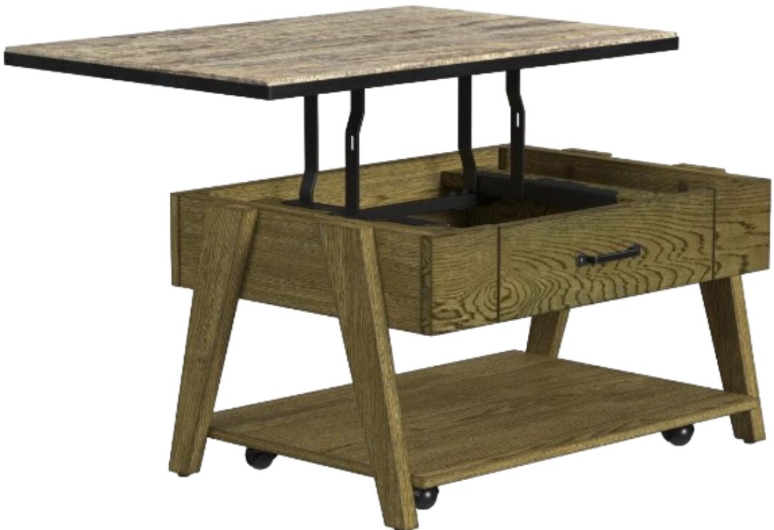 Discover urban sophistication with the Oak Park Collection's Natural Oak Wood Lift-Top Cocktail Table. This stunning centerpiece boasts a modern industrial design, featuring a metal-framed laminate top and angled legs that exude character and charm. With its lift-top mechanism, hidden storage under the lifted top, and convenient bottom shelf, this table offers both style and functionality.Read More