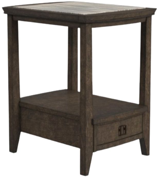 This Chairside End Table features updated, elegant transitional styling combining a beautiful brown and gray multi-toned laminate top and a Sable wood finish. It has an antique brass hardware that accentuates this group and makes it a uniquely beautiful marketable design.Read More